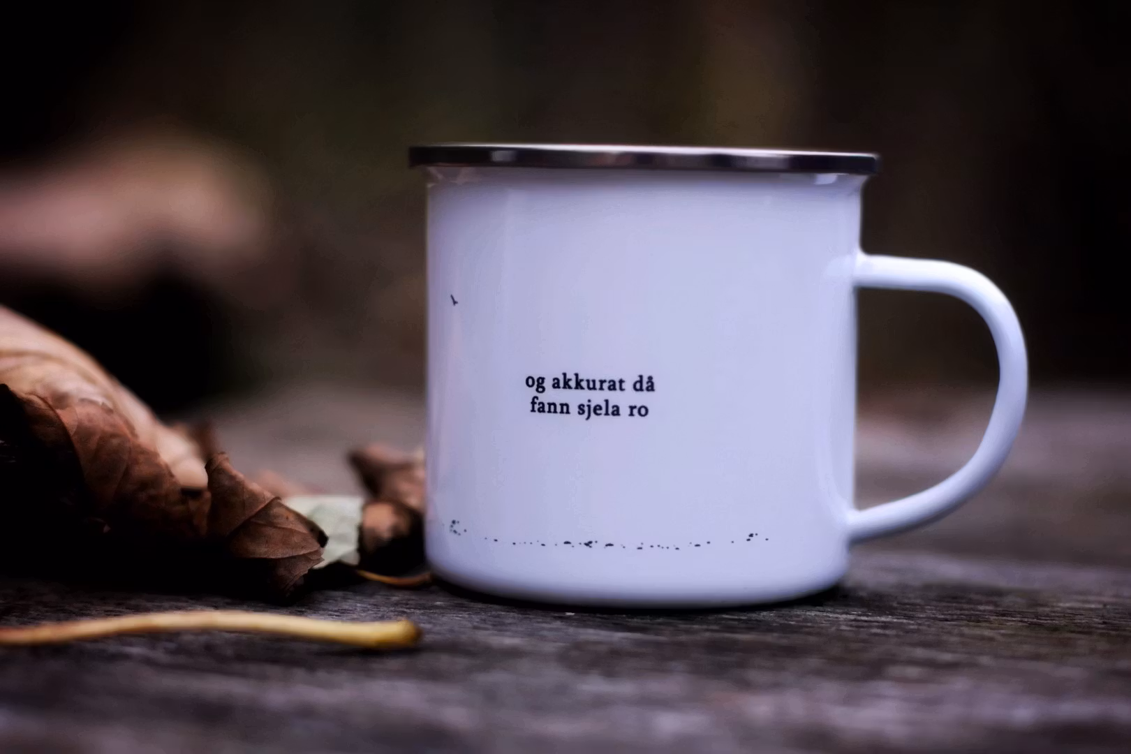 Nydeleg kopp i metall, perfekt til å nyte ein kopp kaffi eller kakao medan ein slappar av og nyter naturen,